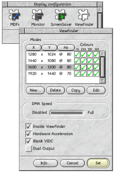 VFSetup provides facilities for setting up the Configured options on the ViewFinder card, such as DMA speed, hardware acceleration and VIDC blanking, along with an editor for the mode definitions used by the ViewFinder Display utility on the iconbar. From version 1.04 onwards, VFSetup is bundled with ViewFinderPatches from Justin Fletcher. This patch does away with the unnecessary ViewFinder Display icon and integrates ViewFinder fully in to the RISC OS mode system. Modes can be selected via the normal display manager and other apps that enumerate screen modes (eg FlipTop/Doom) will work as expected now.